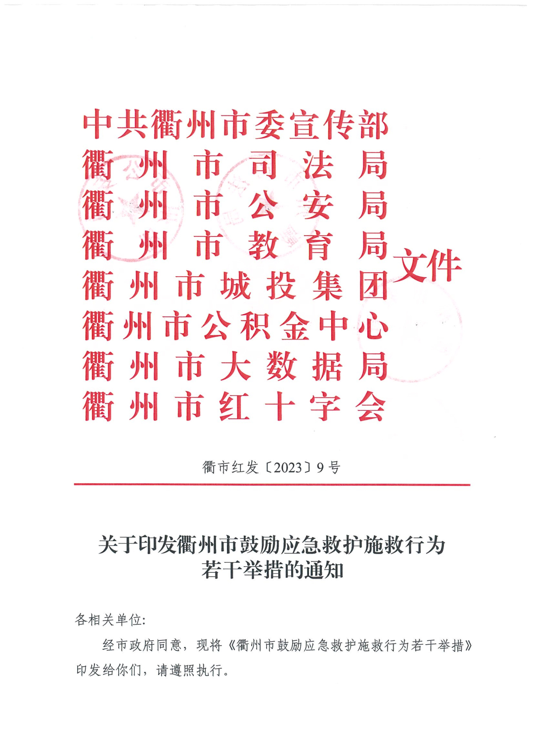 近日,经衢州市政府同意,市委宣传部、市司法局、市公安局、市教育局、市城投集团、市公积金中心、市大数据局、市红十字会等8部门联合印发《衢州市鼓励应急救护施救行为若干举措》(以下简称《举措》),标志着应急救护施救行为在该市获得制度性鼓励和保护。
