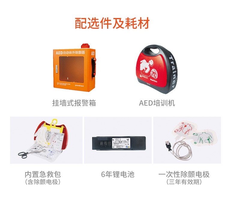 (8)内置急救包:机盖内标配小型急救包,内配:手套、剃毛刀、安全剪刀、口对口呼吸膜、操作指导卡等急救常用的配件(市场极少能做到这点)。