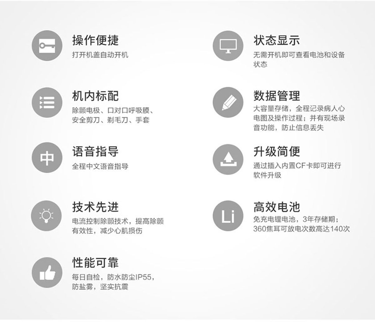 (4)便捷开机:打开机盖自动开机,有效节约抢救时间(市场只有部分型号能做到开盖自动开机)。