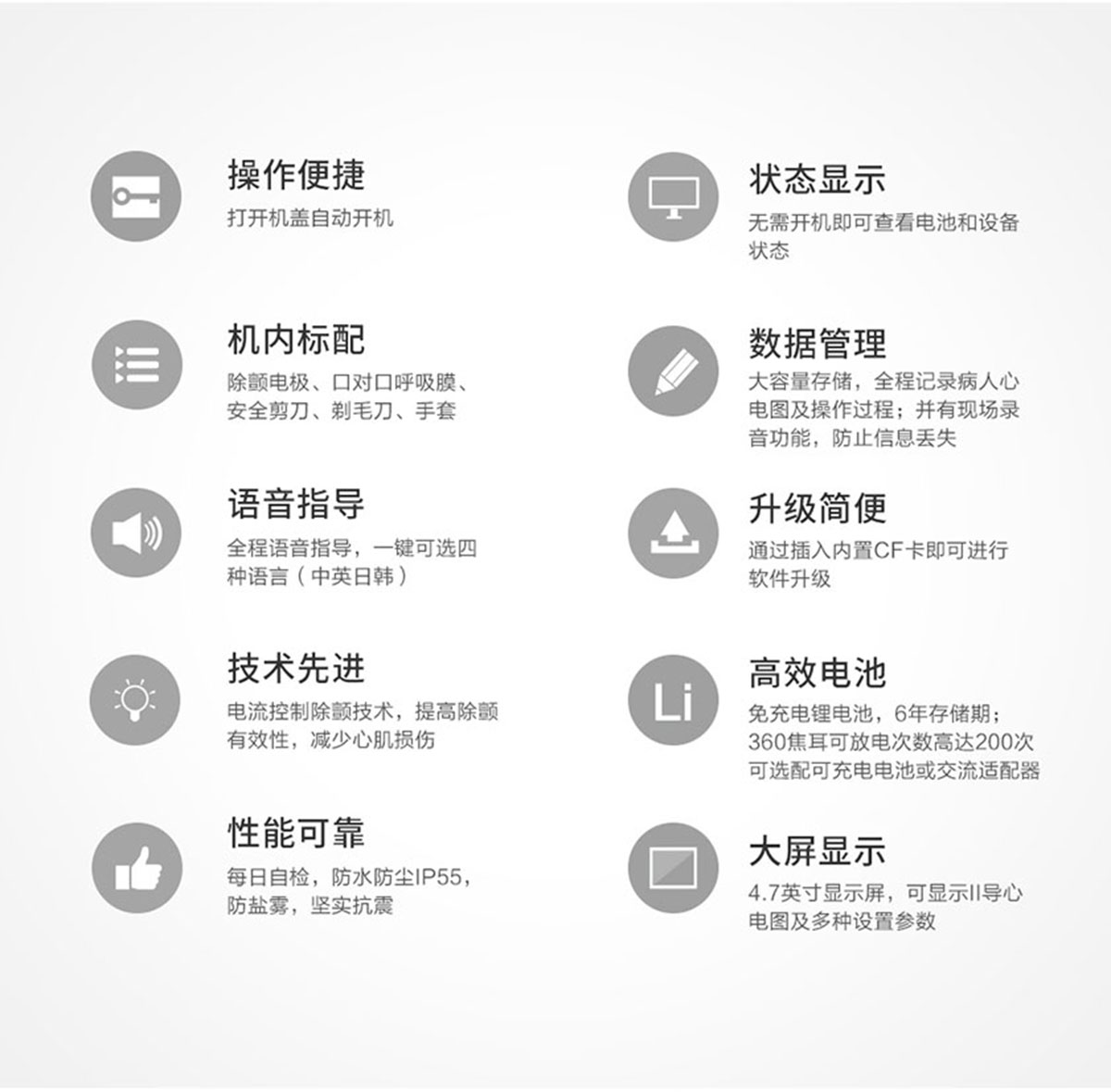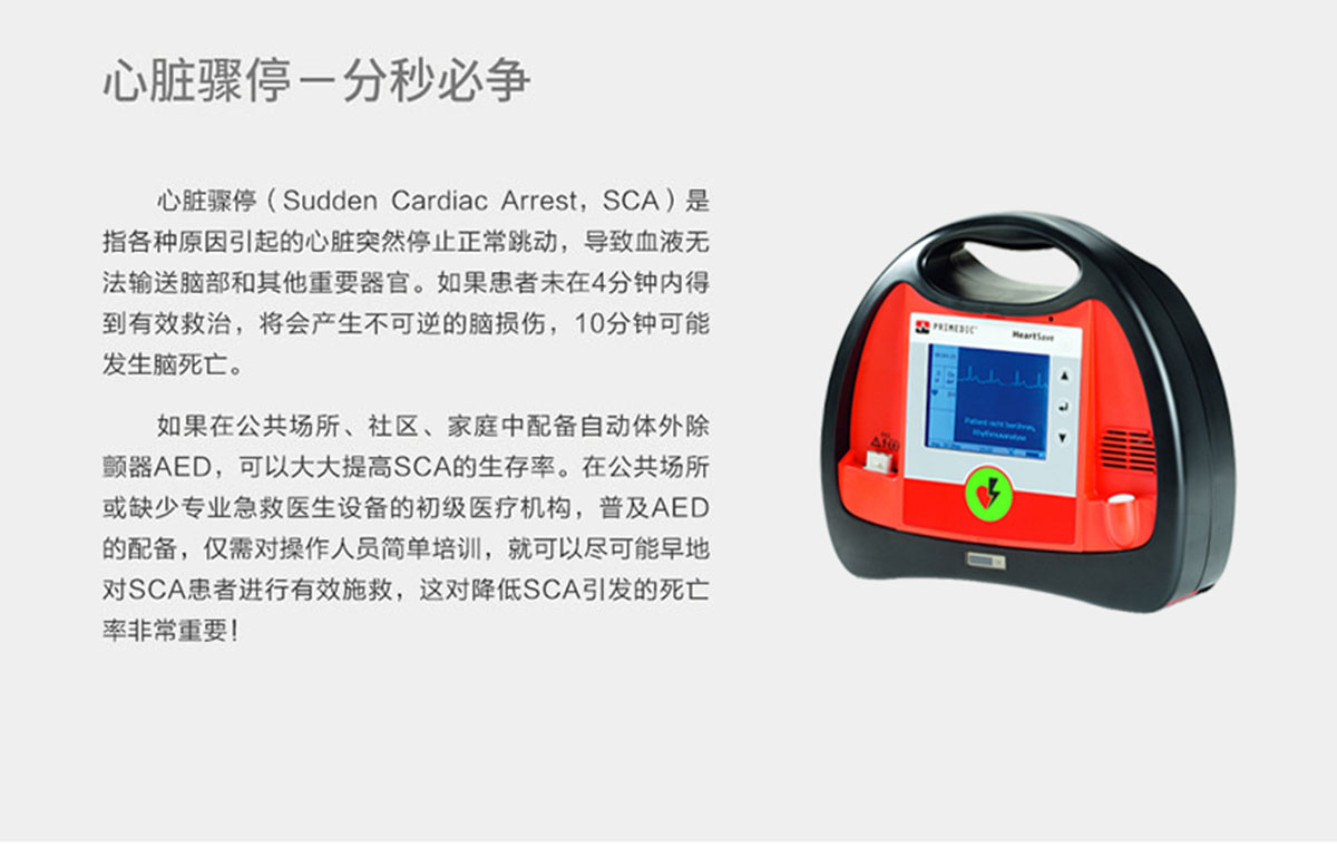 普美康AED自动体外除颤器HeartSave AED-M具有性能优越、功能实用、操作便捷、维护方便等热点。产品运用最新电流控制除颤技术(CCD),除颤能量最大可达360J;防水防尘级别IP55;免充电锂电池效期长达6年+;标配2G存储卡和心电图浏览分析软件;中英日韩4种语言可选。